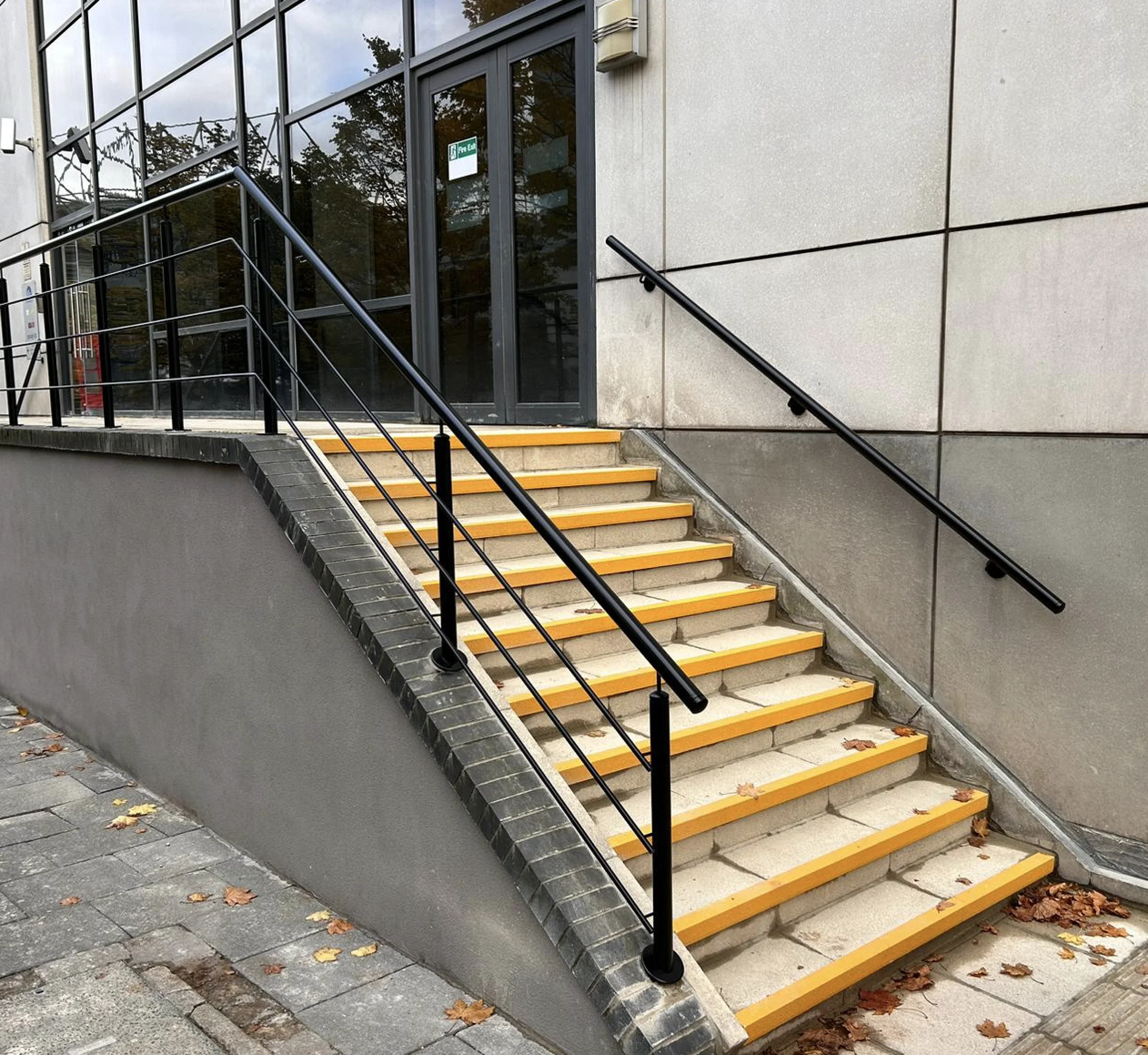 Eight floors of powder-coated steel balustrades and handrails recoated floor by floor. Stairwells stayed accessible throughout.